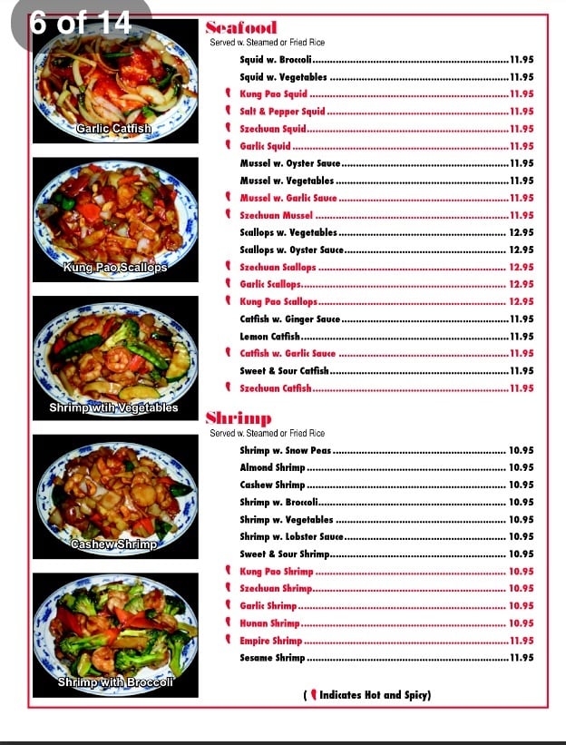 Jumbo shrimp, beef, carrot, water chestnut, baby corn, bamboo, snow pea, bell pepper and onion with spicy sauce. Hot and spicy.