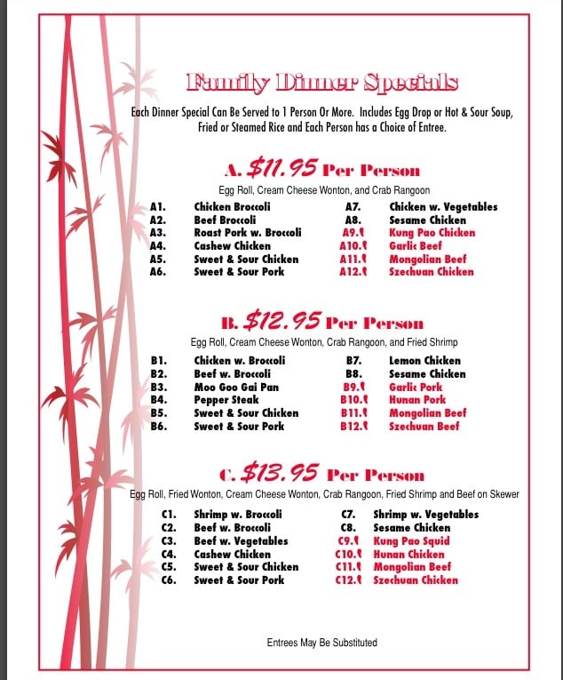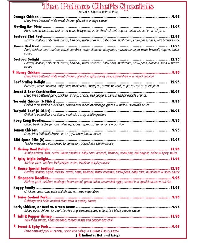 Welcome to Tea Palace, where vibrant flavors of Chinese cuisine meet a cozy ambiance in Pueblo, CO. This unclaimed gem offers a diverse menu featuring tantalizing appetizers like crispy egg rolls and a delightful Pu Pu platter. The chef specials shine with dishes like Lemon Chicken and the colorful Sizzling Hot Plate, ensuring there's something for everyone, including vegan and vegetarian options.